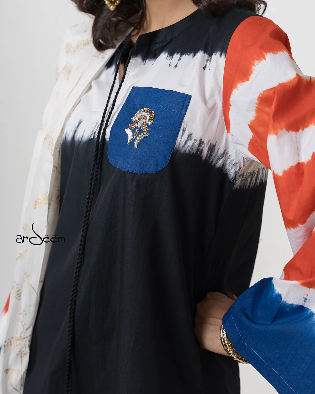 This stylish black, 100% cotton kameez features red and blue tie-dye work. The contrast pocket with karchupi detailing, along with matching tassels, sets it apart from the ordinary. Vibrant accents add ethnic charm, while an off-white dupatta with intricate golden hand-blocking completes the look.