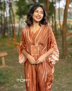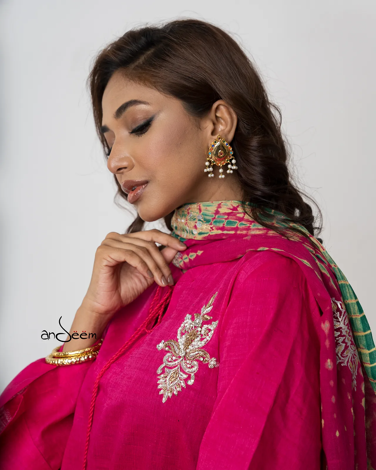 Pink endi cotton kameej with karchupi work on the neckline, paired with an ivory sharara and vibrant tie-dye dupatta.