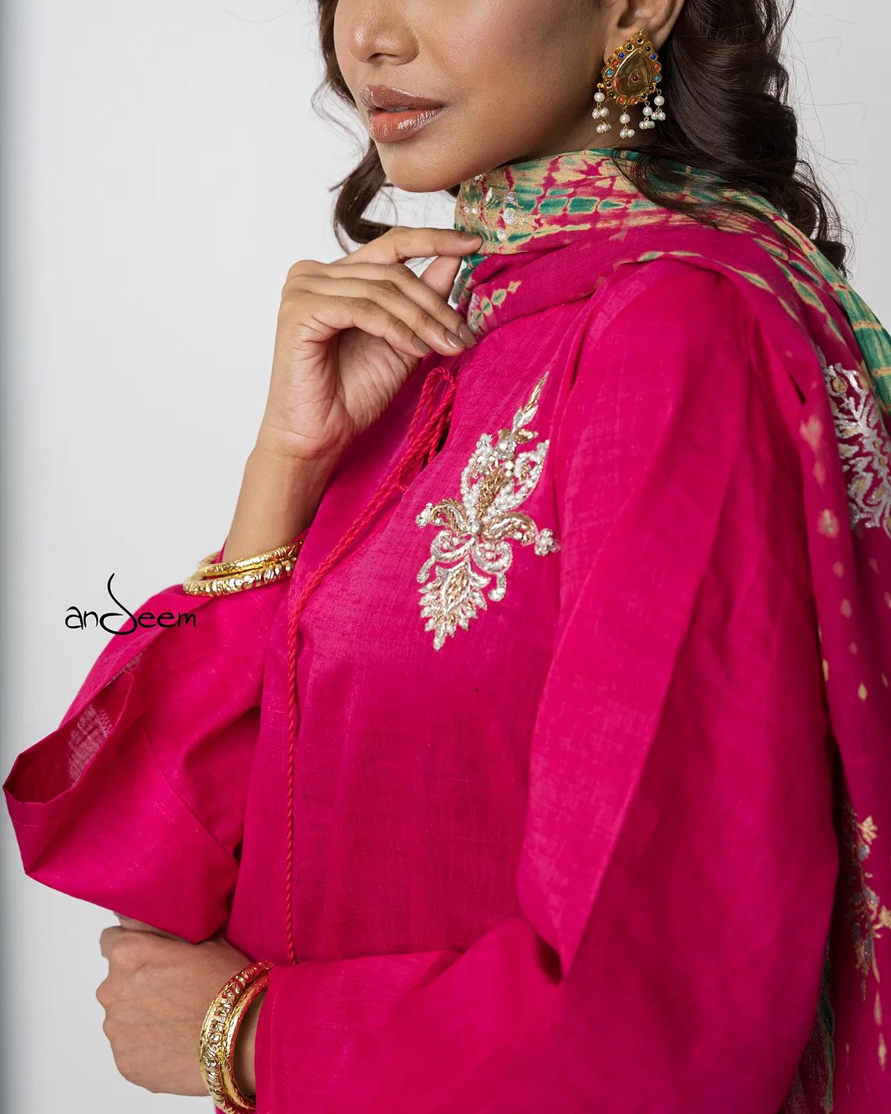 Pink endi cotton kameez with tassels and detailed karchupi work, paired with a hand-dyed, hand-blocked cotton dupatta. Finished with cream cotton sharara pants for a complete, elegant look.