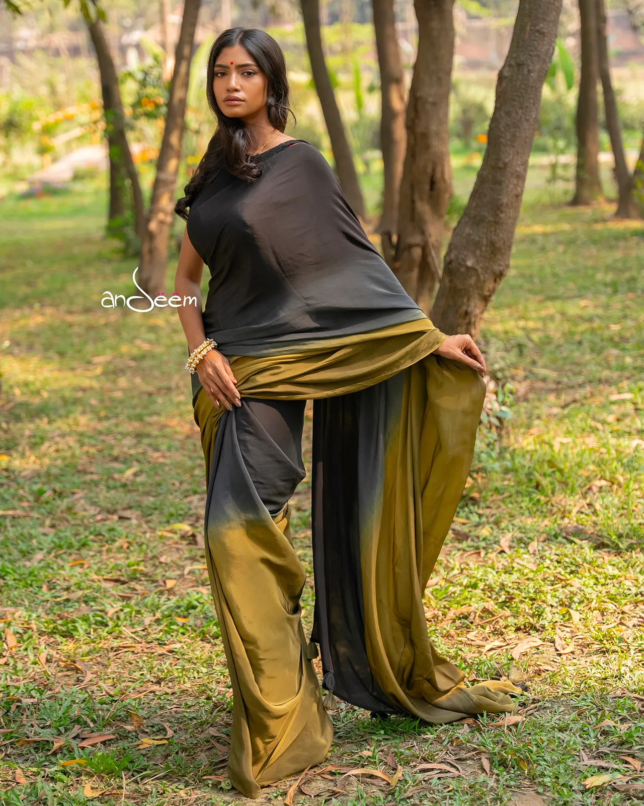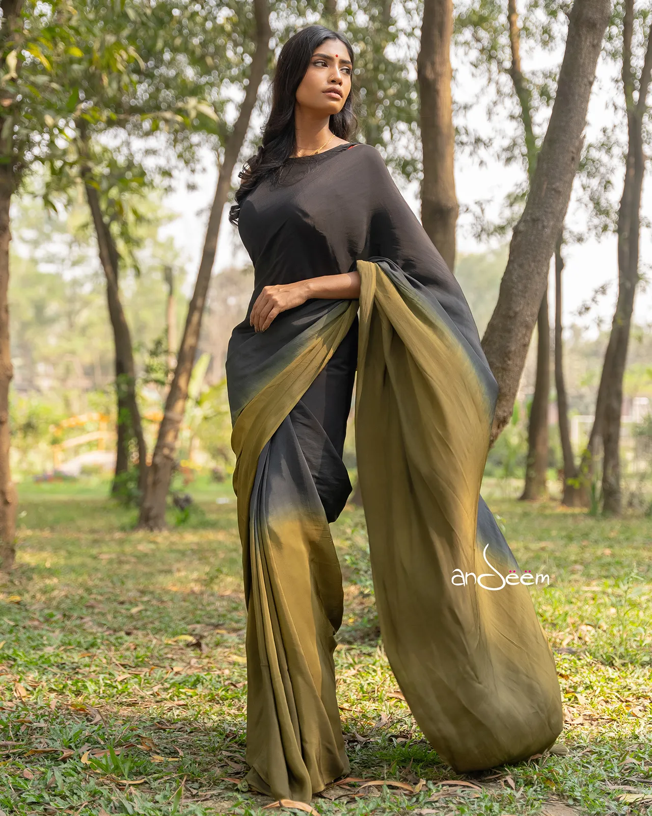 Black and olive green saree is made from luxurious crepe silk, offering a smooth and breathable drape. The stylish ombre blends deep black into olive green for a timeless, modern look.