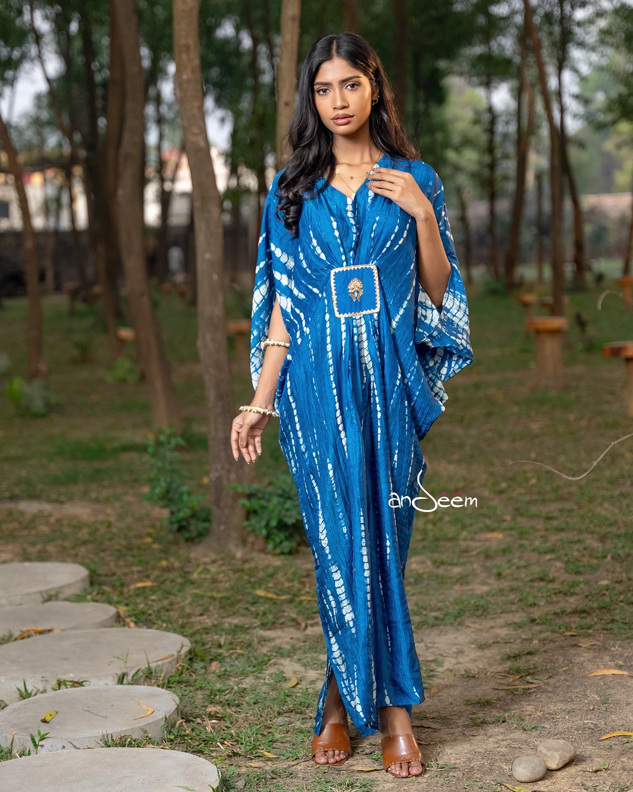 Body SizeThis long, soft, blue silk one-piece features slits on both sides and on the sleeves, aorned with all-over tie-dye for a striking look. Elegant karchupi detailing on the center adds a touch of traditional charm.