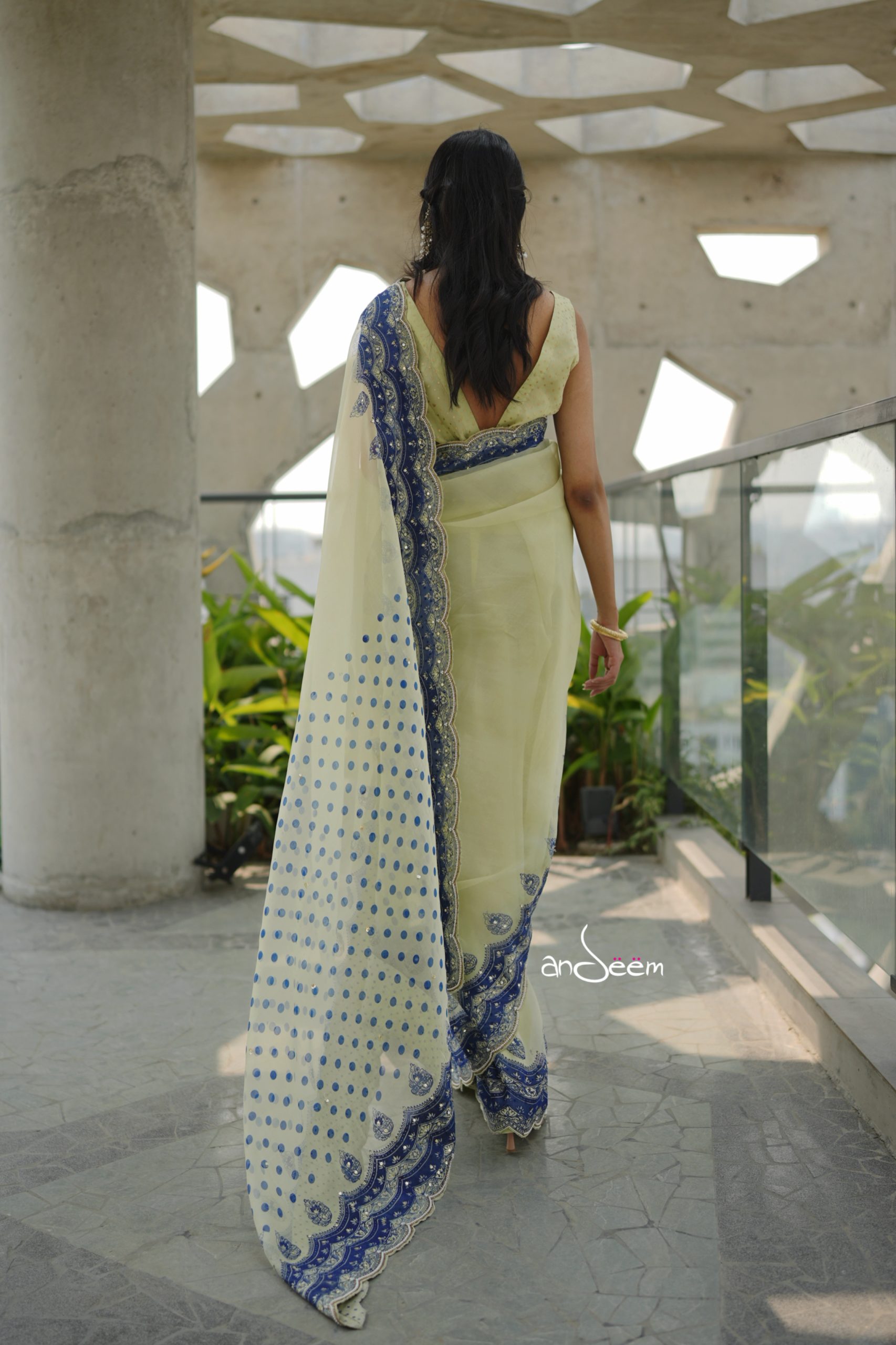 A stunning muslin saree in a soft lime-yellow hue base, beautifully accented with deep sapphire blue scalloped borders, intricate karchupi and screenprint.