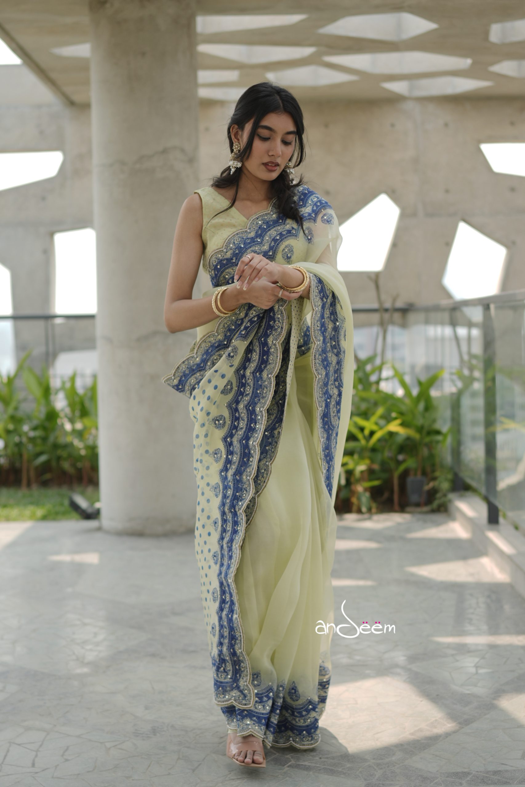 Muslin Saree- Lime Sapphire Grace