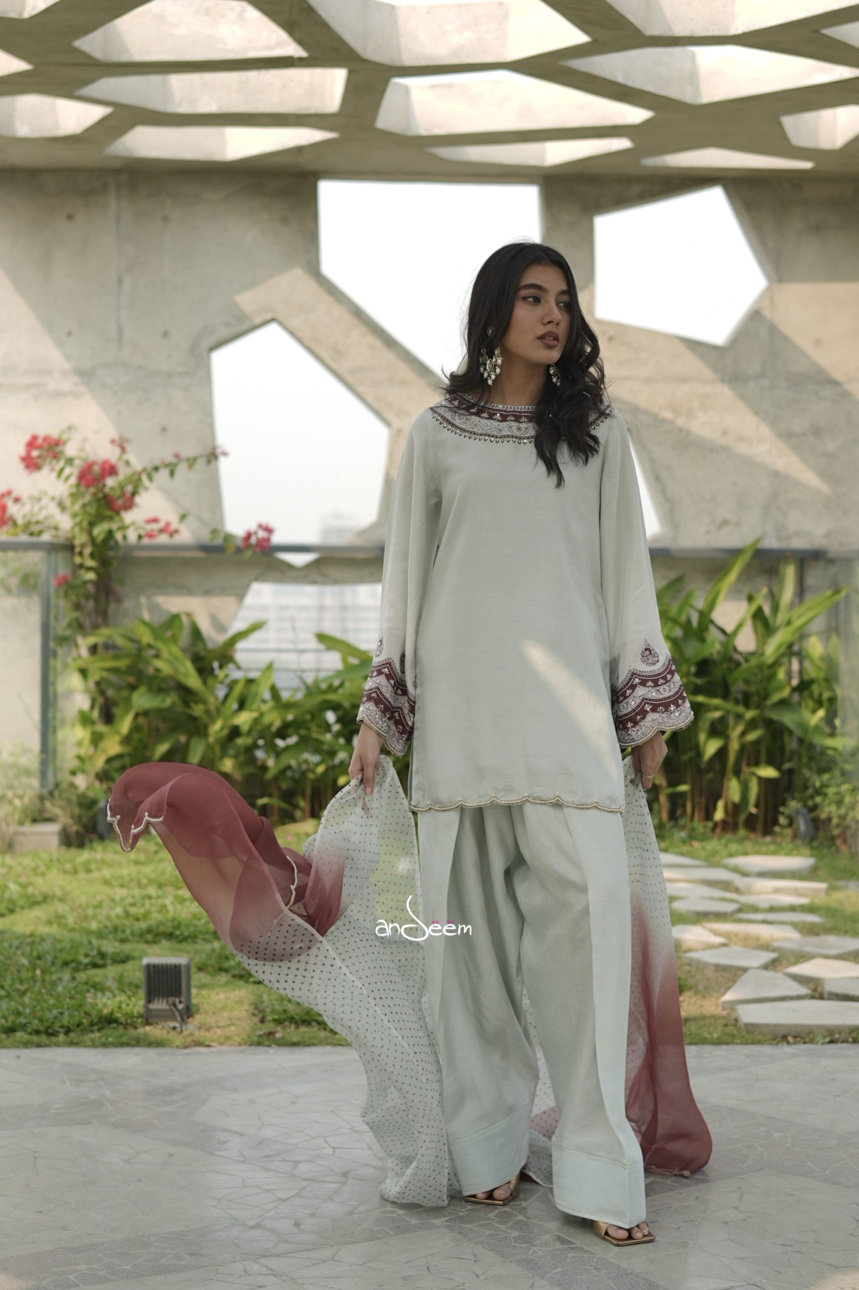 An ash green raw silk kameez with lining, paired with matching raw silk pants for an effortless silhouette. The neckline and sleeves are adorned with a detailed screen print and intricate karchupi work. Finished with a pure muslin dupatta in ash green and mocha ombre, delicately screen-printed and accented with intricate karchupi edges.