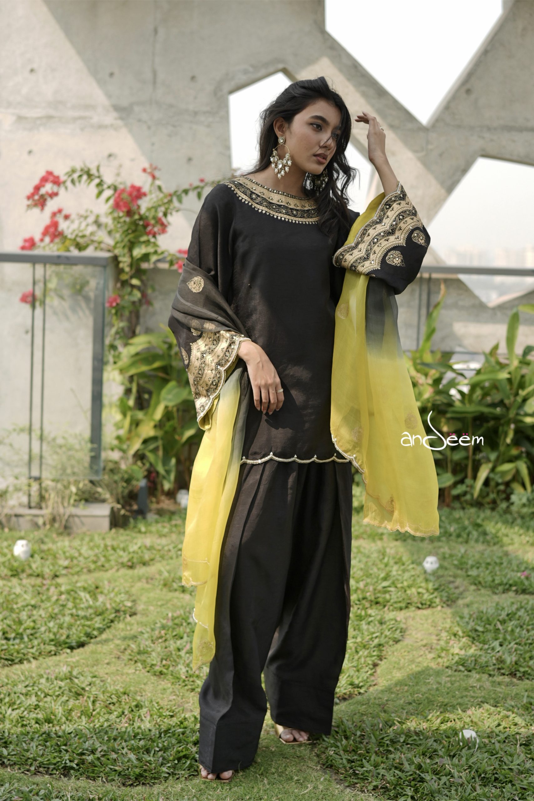 A black raw silk kameez with lining, paired with matching raw silk pants for an effortless silhouette. The neckline and sleeves are adorned with a detailed screen print and intricate karchupi work. Finished with a pure muslin dupatta in pitch-black and yellow ombre tones, delicately screen printed and accented with intricate karchupi edges.