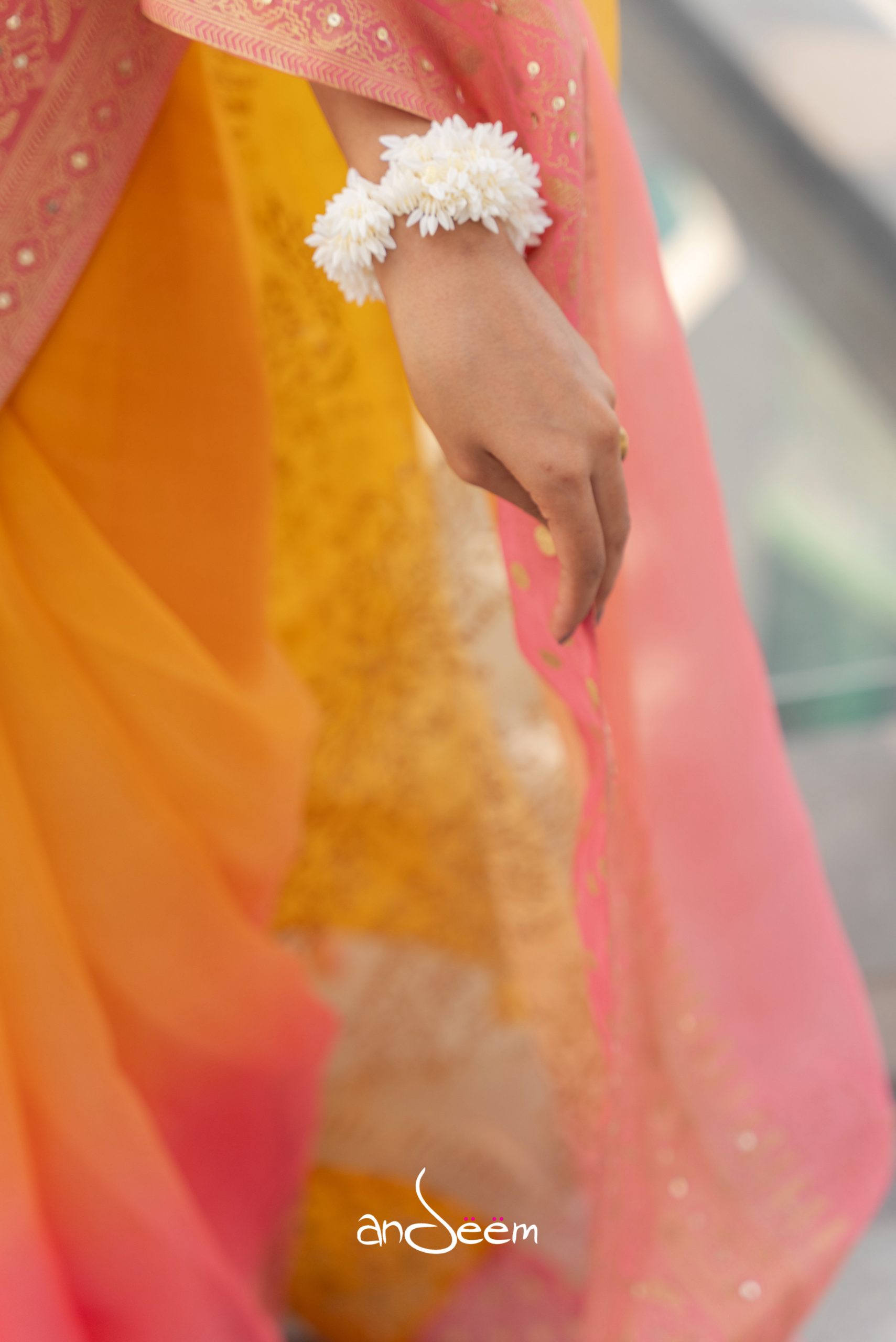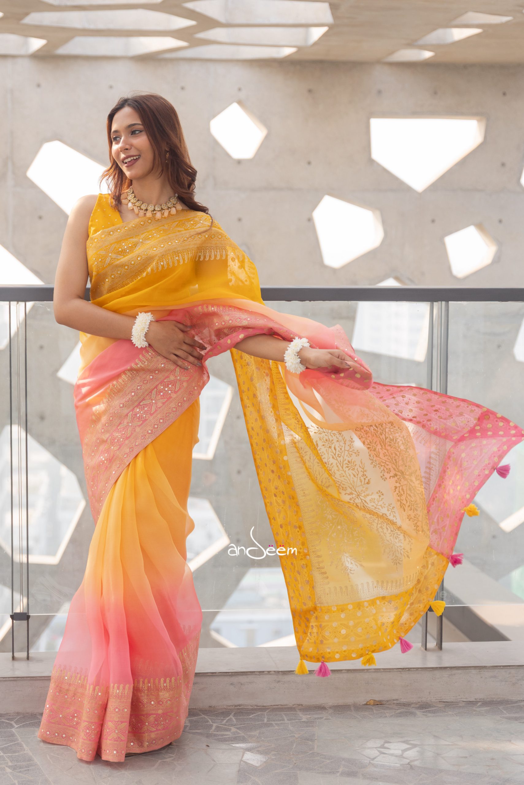 A radiant yellow and peach muslin saree featuring an intricately detailed border crafted with screen print and karchupi work. Finished with a playful polka-dotted underside and tassel details, and paired with a solid muslin blouse piece.
