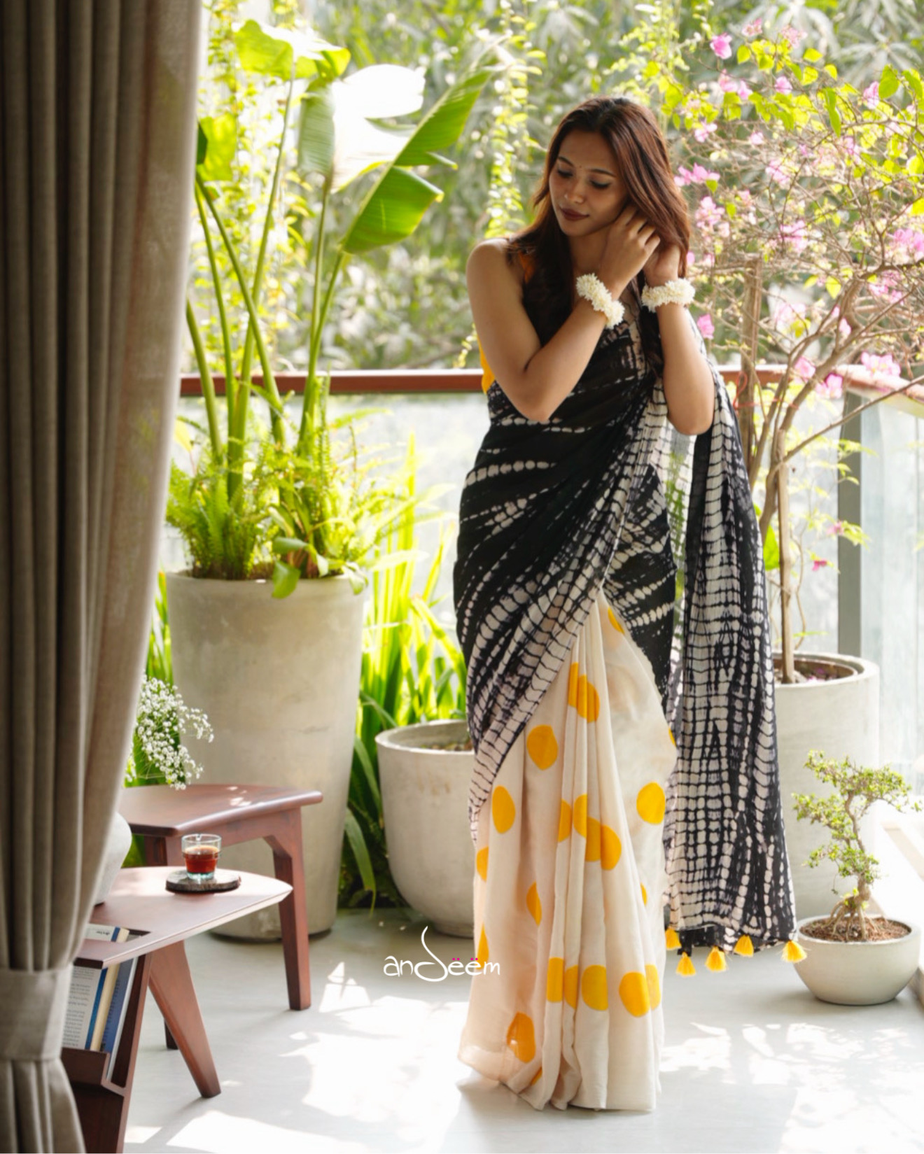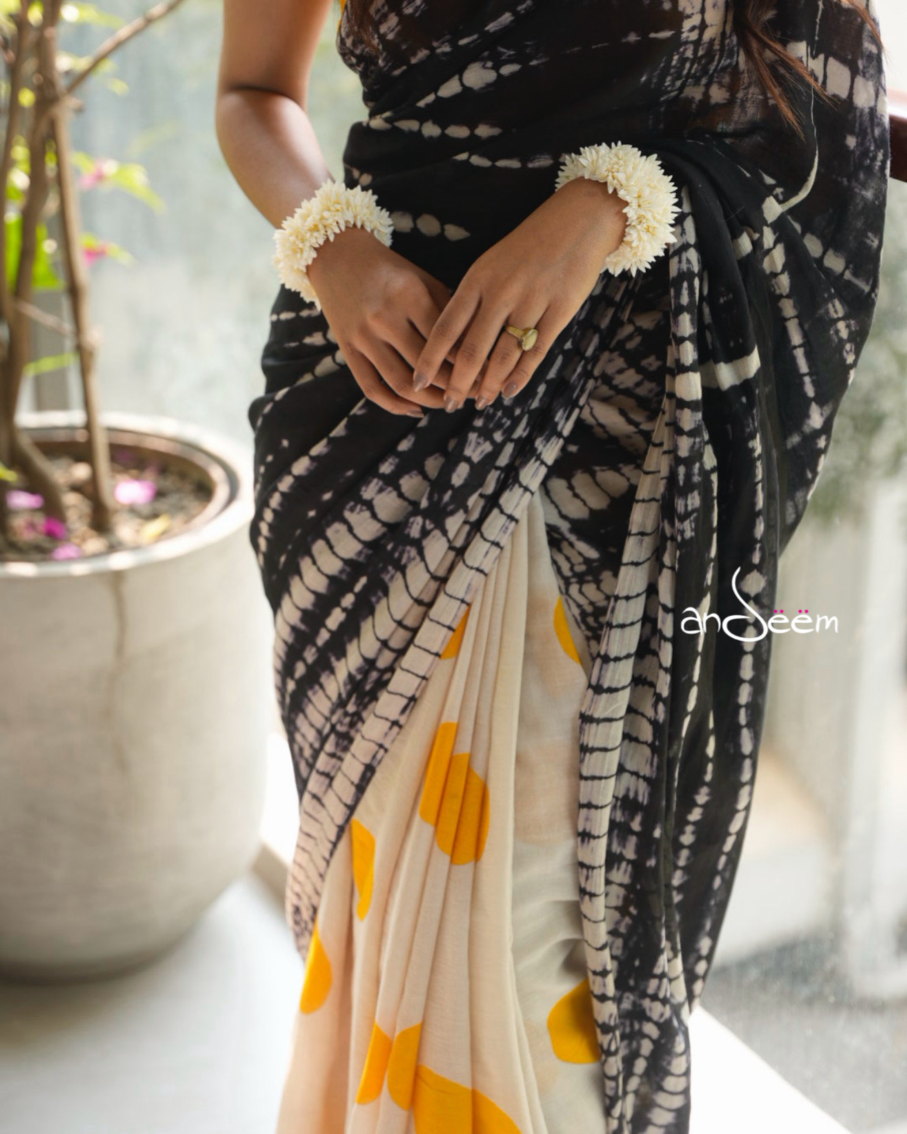 A lightweight cotton saree featuring a bold yellow polka-dotted ivory base paired with a contrasting black tie-dye aachol.