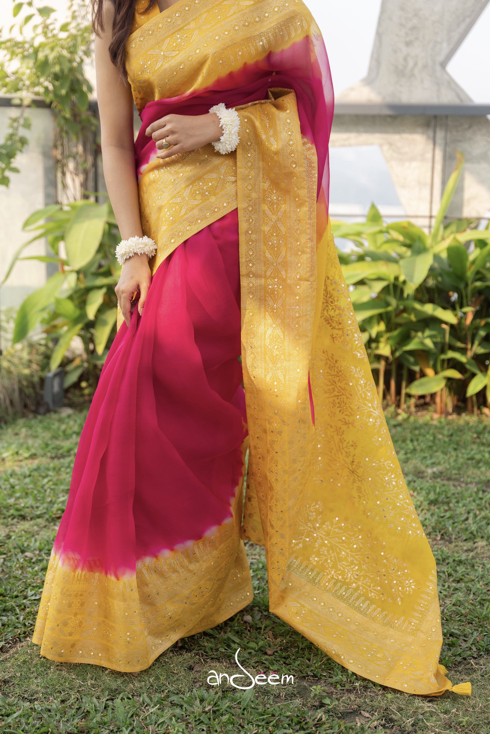 A radiant honey-shade yellow and coral ombre muslin saree, featuring an intricately detailed border crafted with screen print and karchupi work. It is finished with a playful polka-dotted underside and tassel details and comes with a solid muslin blouse piece.
