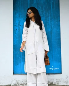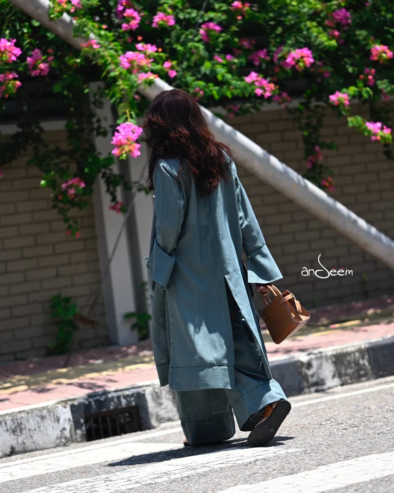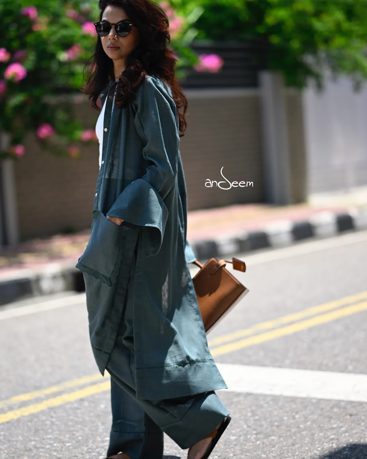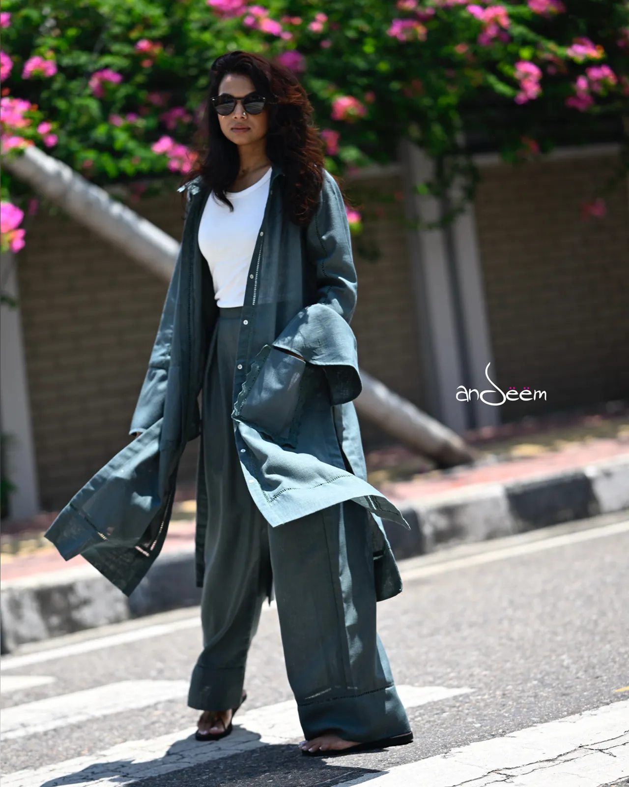 Army green linen cotton shirt paired with matching pants, featuring delicate buttons and lace detailing, finished with stylish long pockets for a chic yet comfortable look.