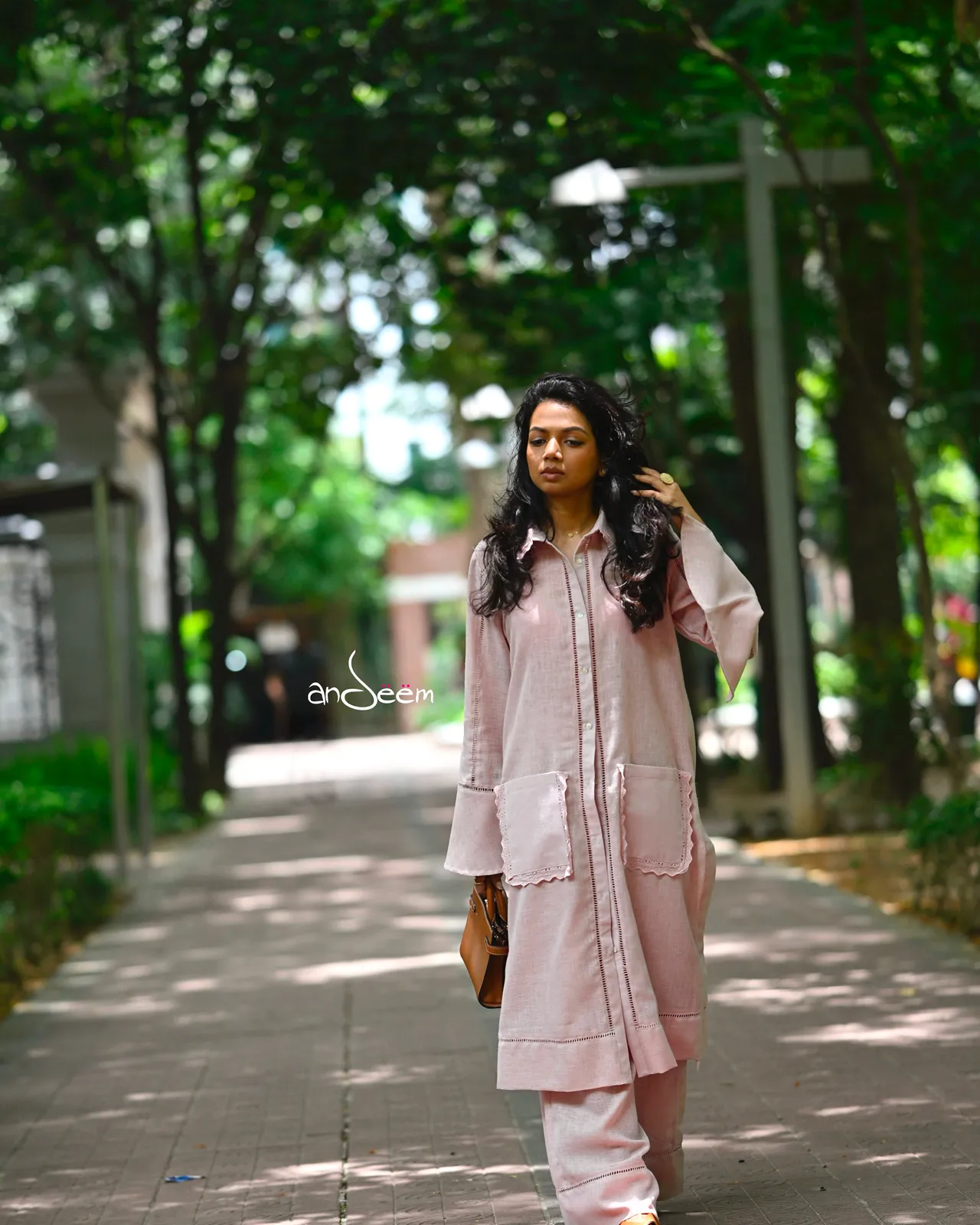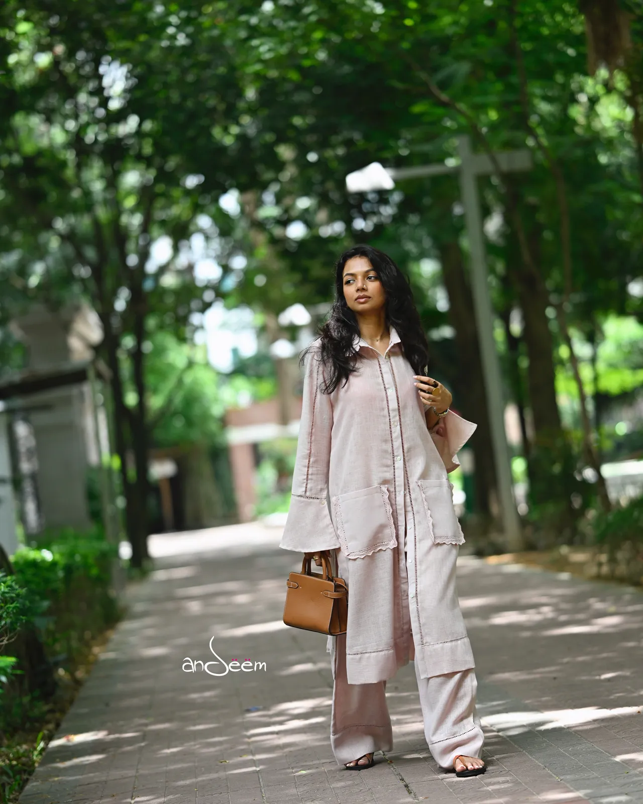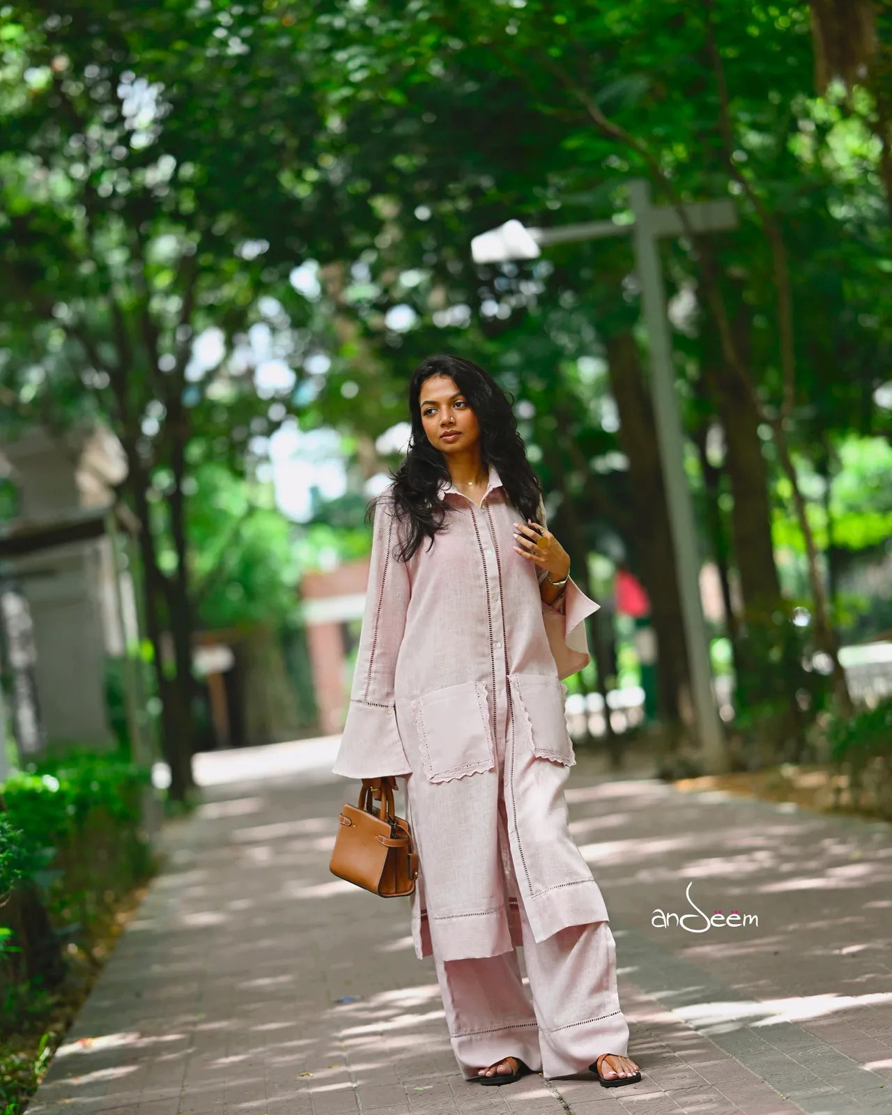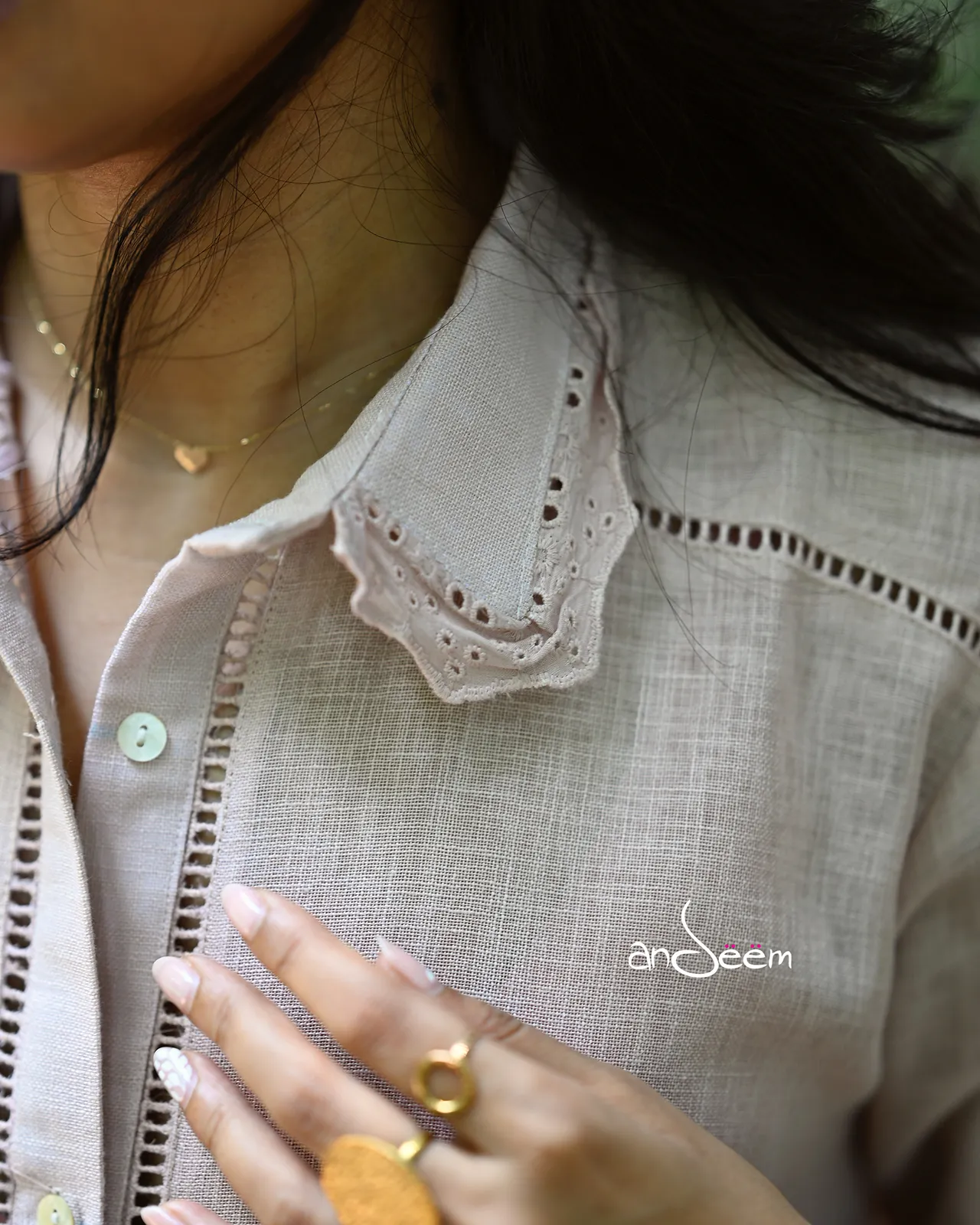 Beige linen cotton shirt paired with matching pants, featuring delicate buttons and lace detailing, finished with stylish long pockets for a chic yet comfortable look.