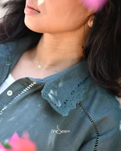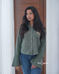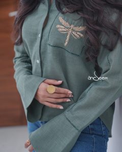 A breezy sand-beige shirt with a relaxed silhouette and statement sleeves, featuring delicate dragonfly embroidery on the pocket and refined ladder stitch detailing for an artisanal touch.