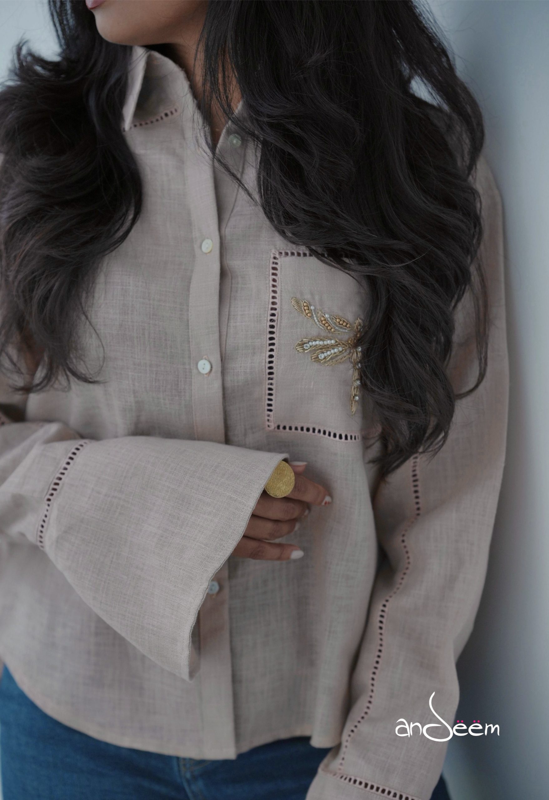 A sand beige linen cotton relaxed shirt with delicate dragonfly embroidery, ladder stitch detailing, and statement sleeves.