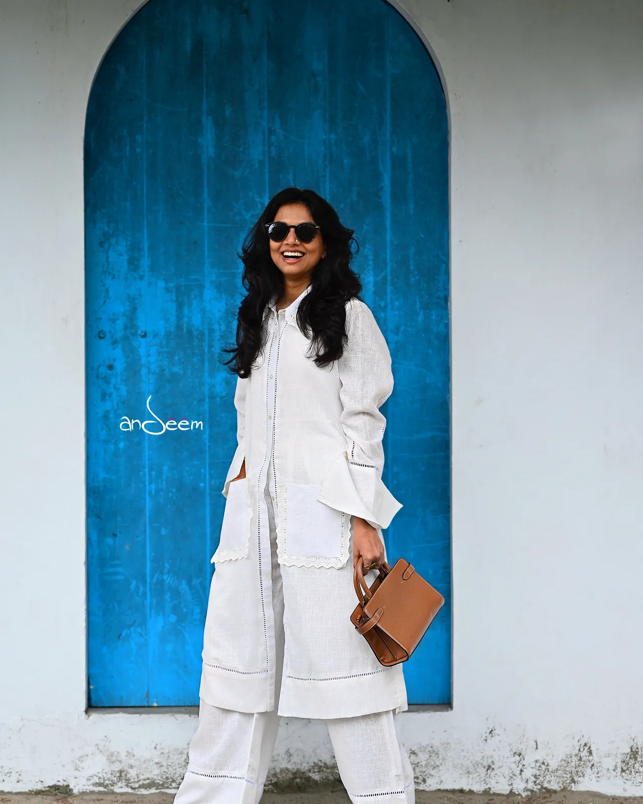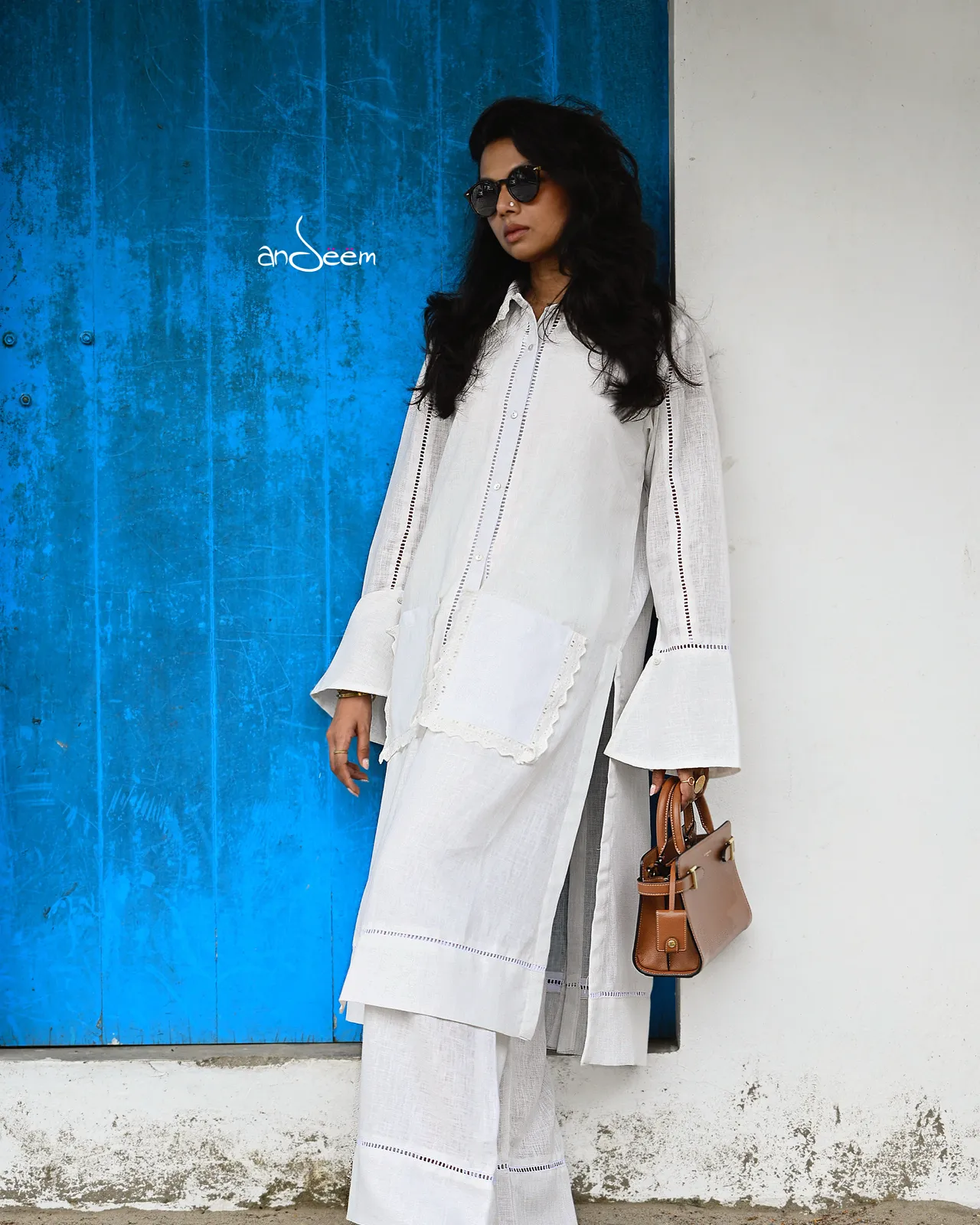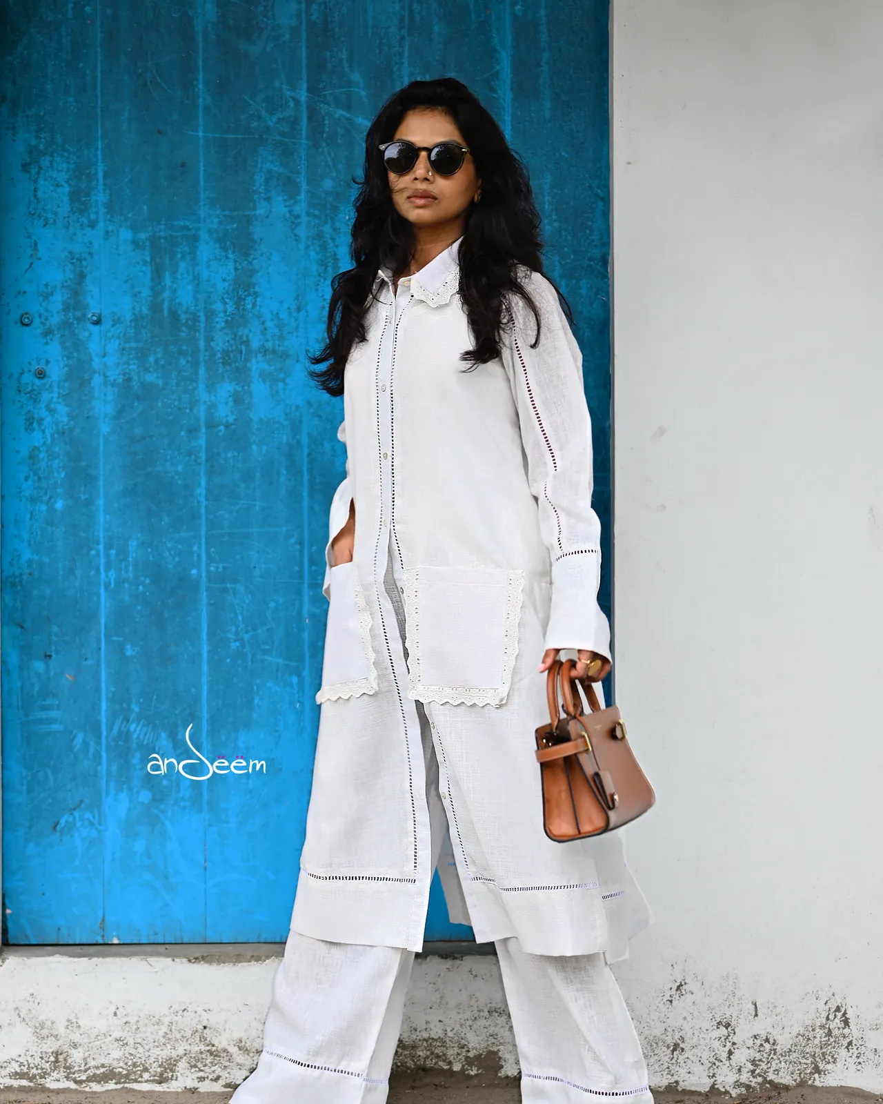 White linen cotton shirt paired with matching pants, featuring delicate buttons and lace detailing, finished with stylish long pockets for a chic yet comfortable look.