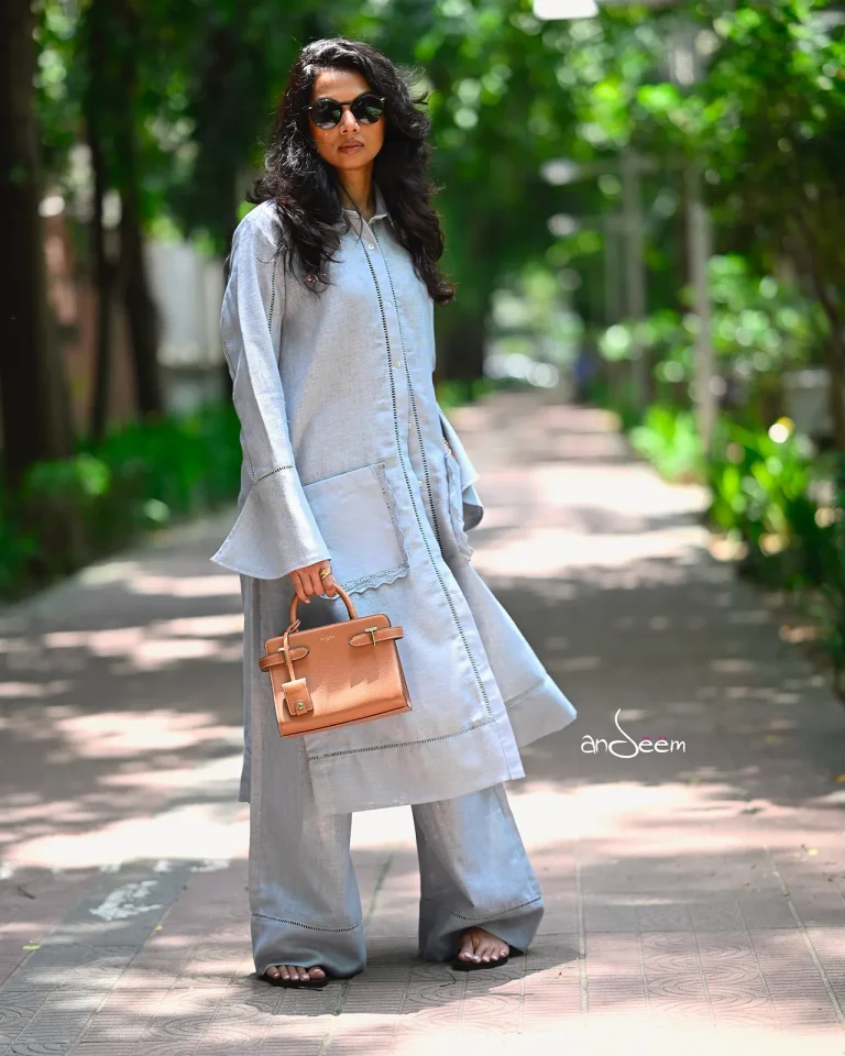 Grey linen cotton co-ords. Featuring balloon sleeves and delicate karchupi detailing on the neckline for a chic, effortless look.