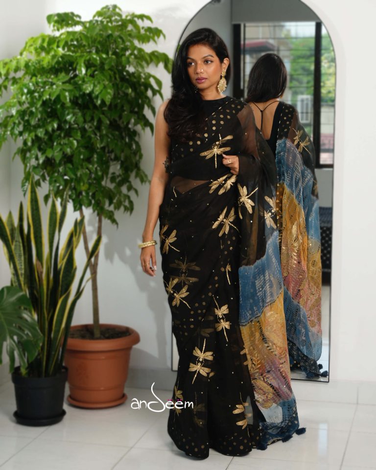 A stunning pure silk muslin saree in classic black, featuring a graceful tie-dye aachol in contrasting colors. The body is beautifully detailed with intricate screen-printed motifs embellished with karchupi work. The saree is finished with bold polka-dotted cord piping and matching tassels.