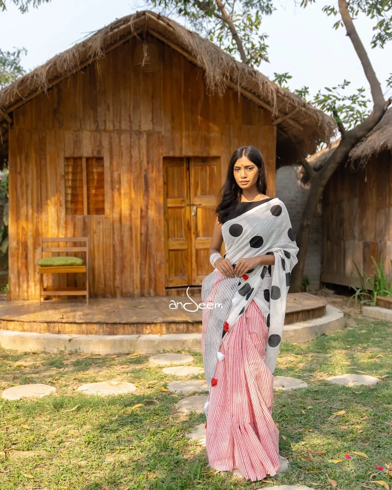 A cotton handloom saree with a white base, accented with oversized black polka dots, and a striped red aachol with red and white tassels.