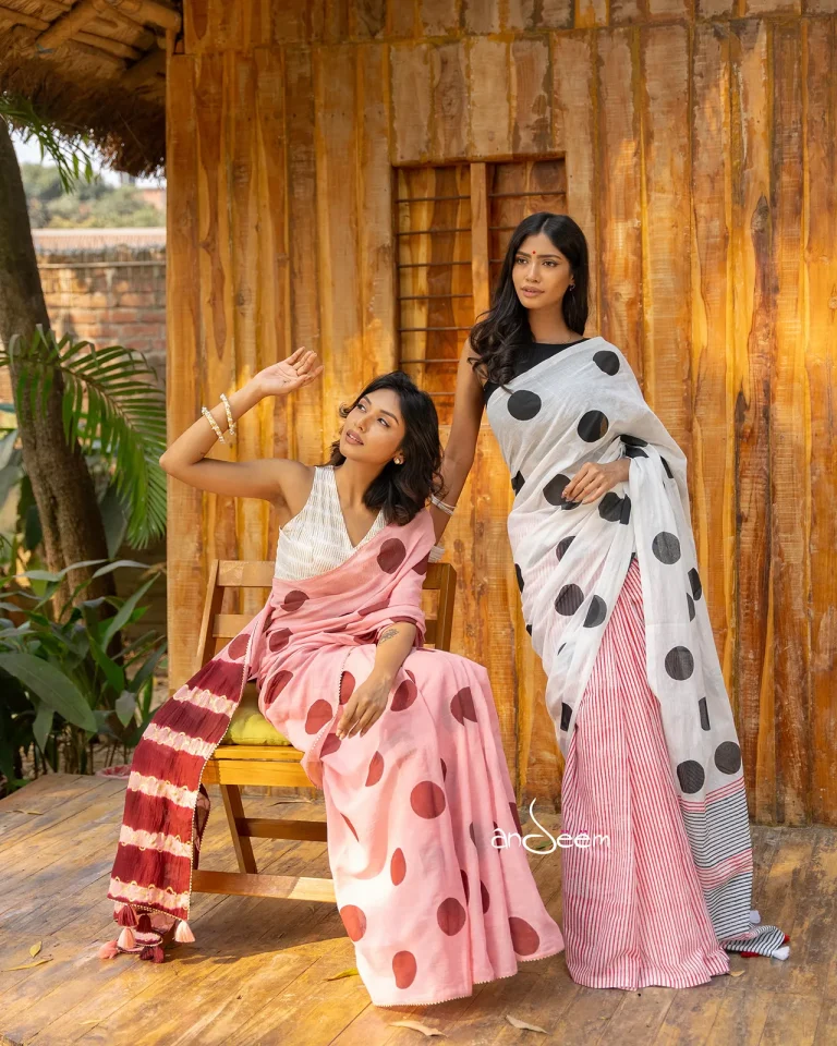 A cotton handloom saree with pastel and yellow polka dots, finished with yellow tassel accents, blending elegance with striking charm.
