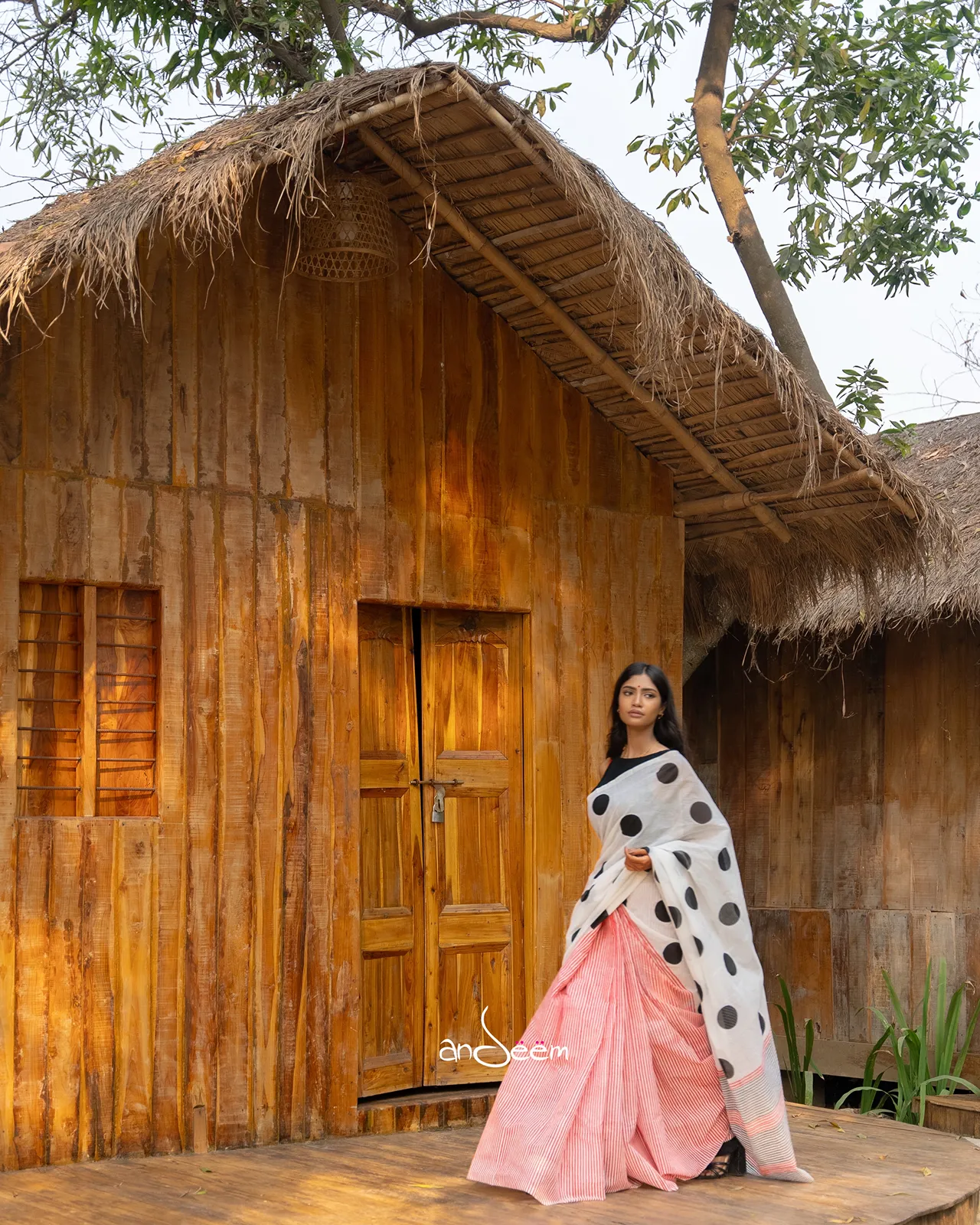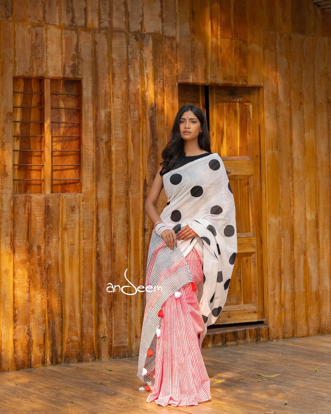 This saree features a white base, accented with oversized black polka dots, offering a vibrant yet elegant appeal. A bold striped red aachol, finished with red and white tassels, adds striking contrast, while its lightweight texture ensures comfort with sophistication.