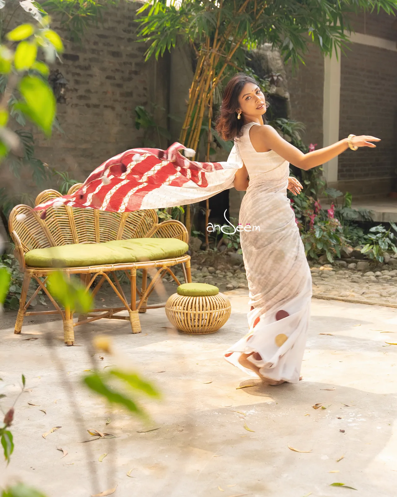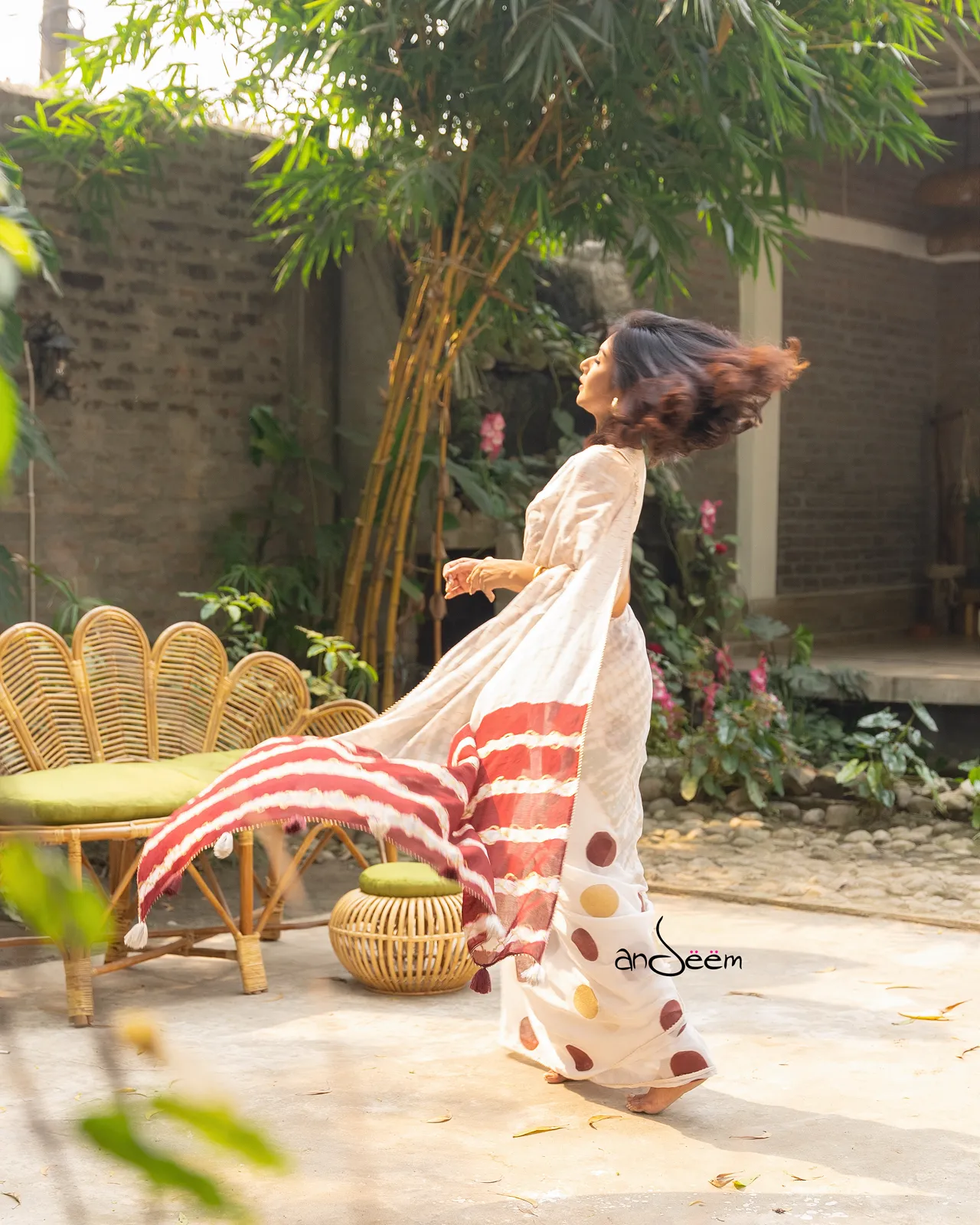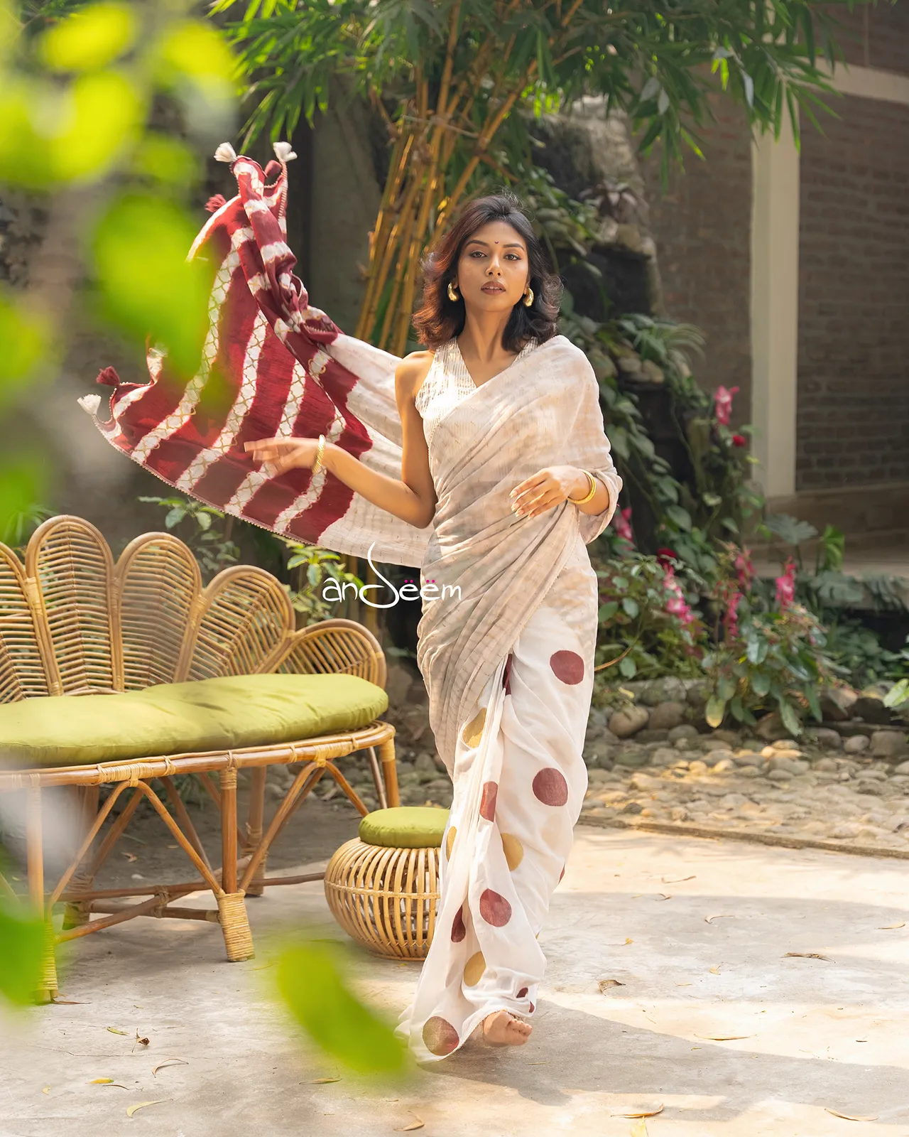 This saree features a soft beige tie-dye base, accented with oversized maroon and mustard polka dots, offering a vibrant yet elegant appeal. A bold striped maroon aachol, finished with off-white and maroon tassels, adds striking contrast, while its lightweight texture ensures comfort with sophistication.