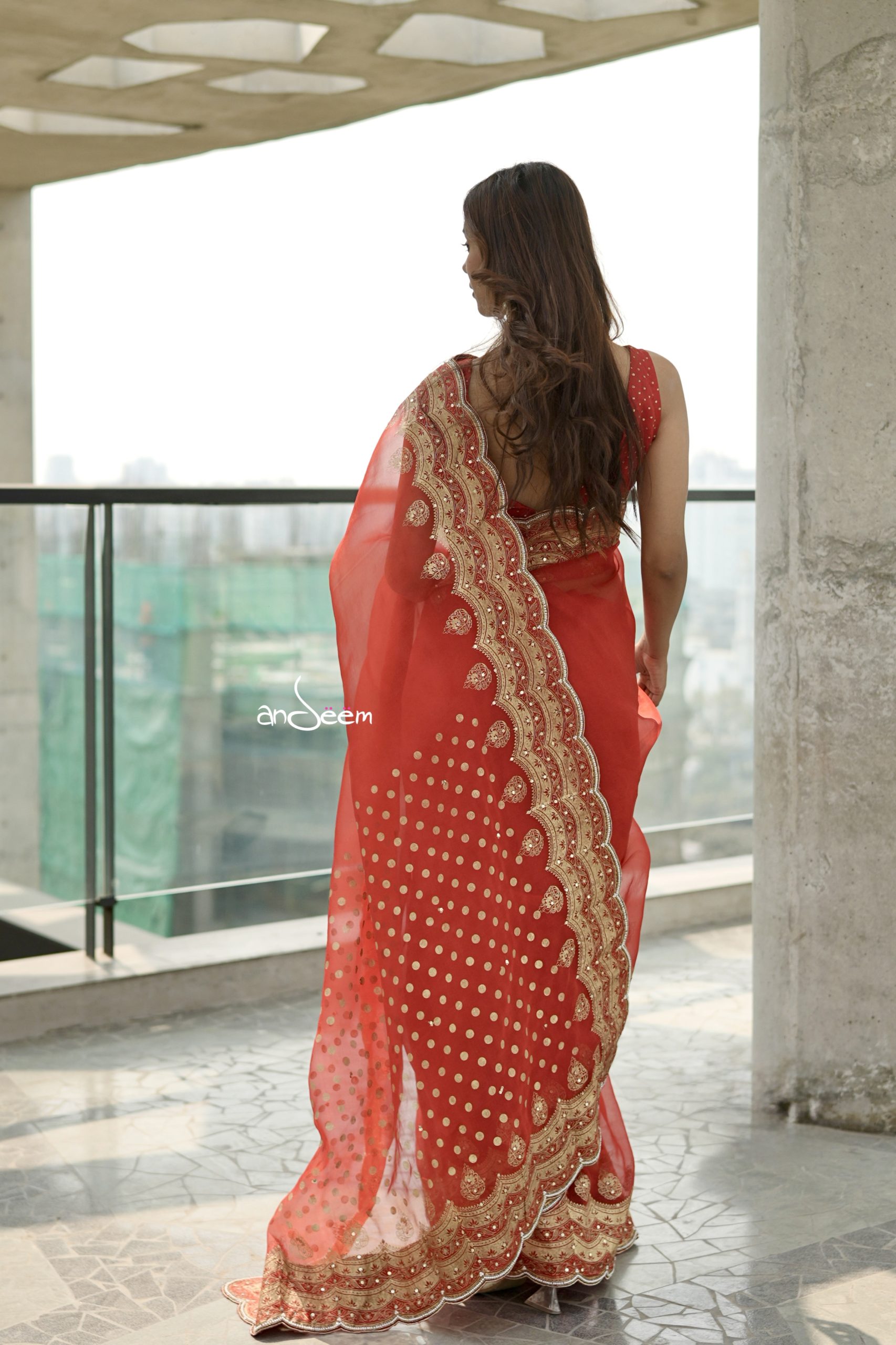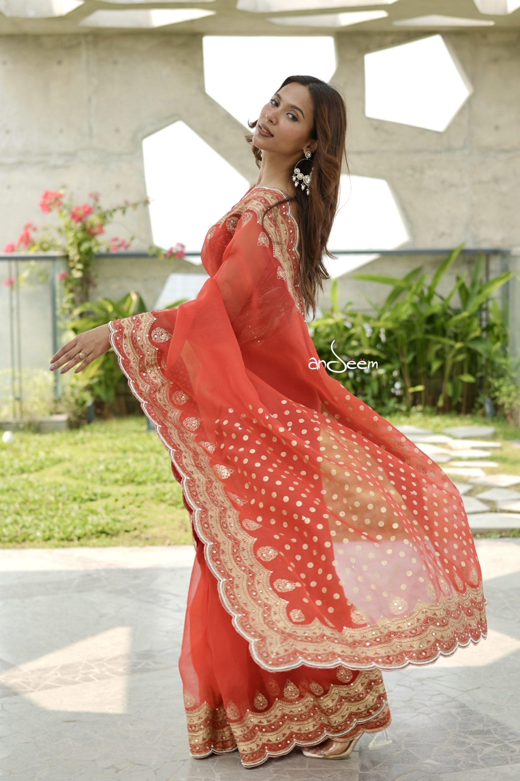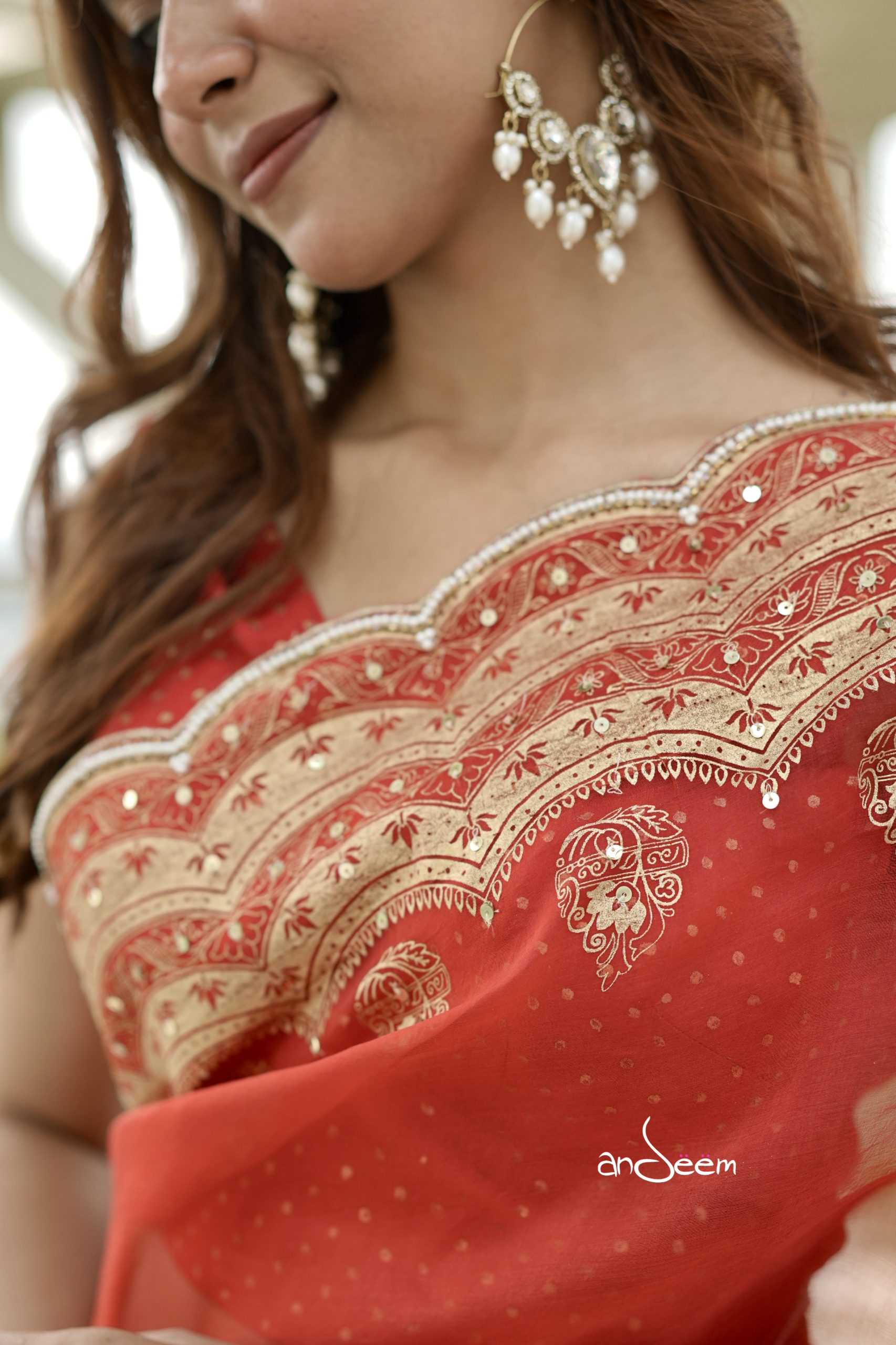 A graceful muslin saree in a cherry red base, beautifully elevated with deep golden scalloped borders and intricate karchupi and screenprint.