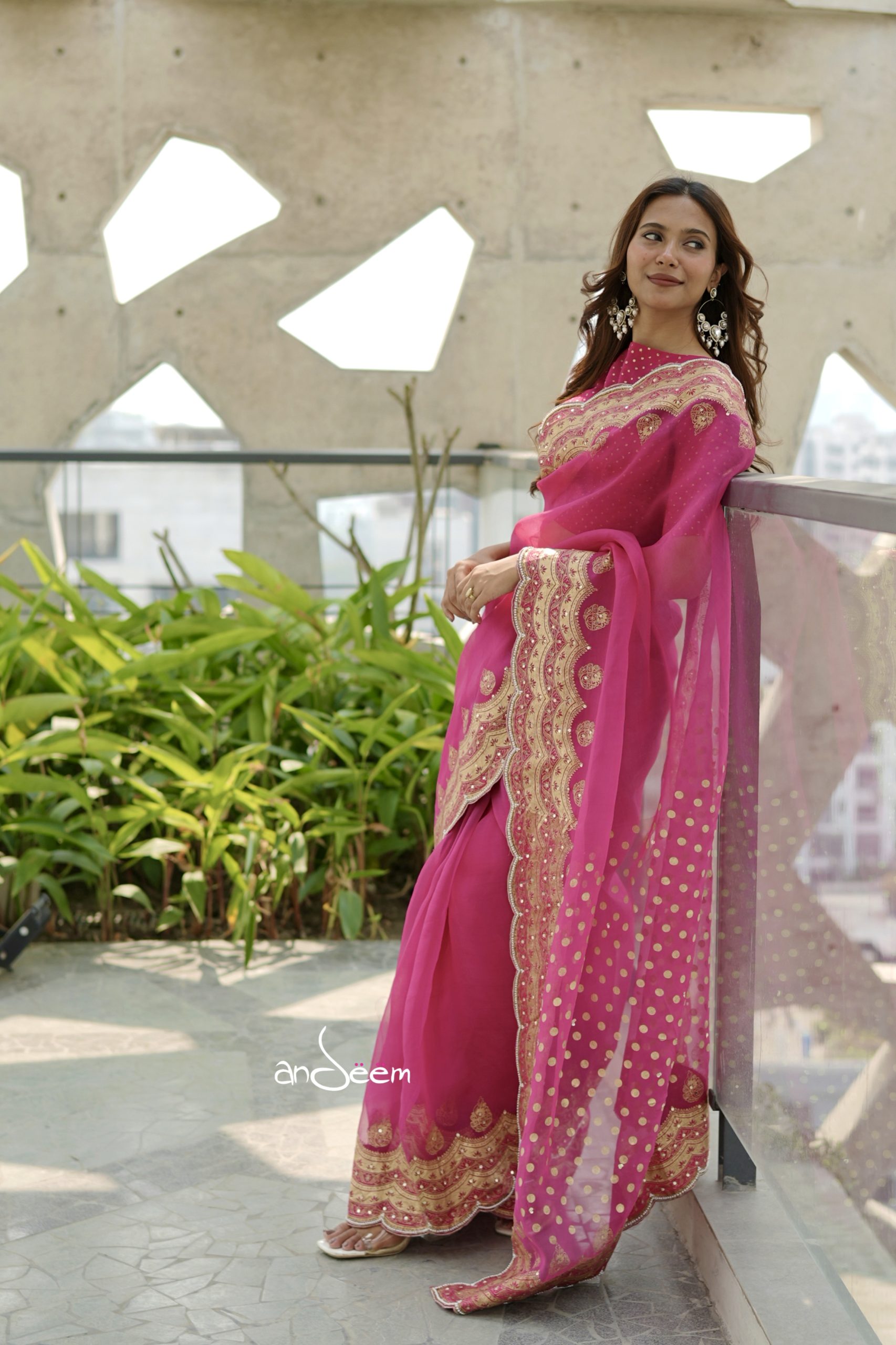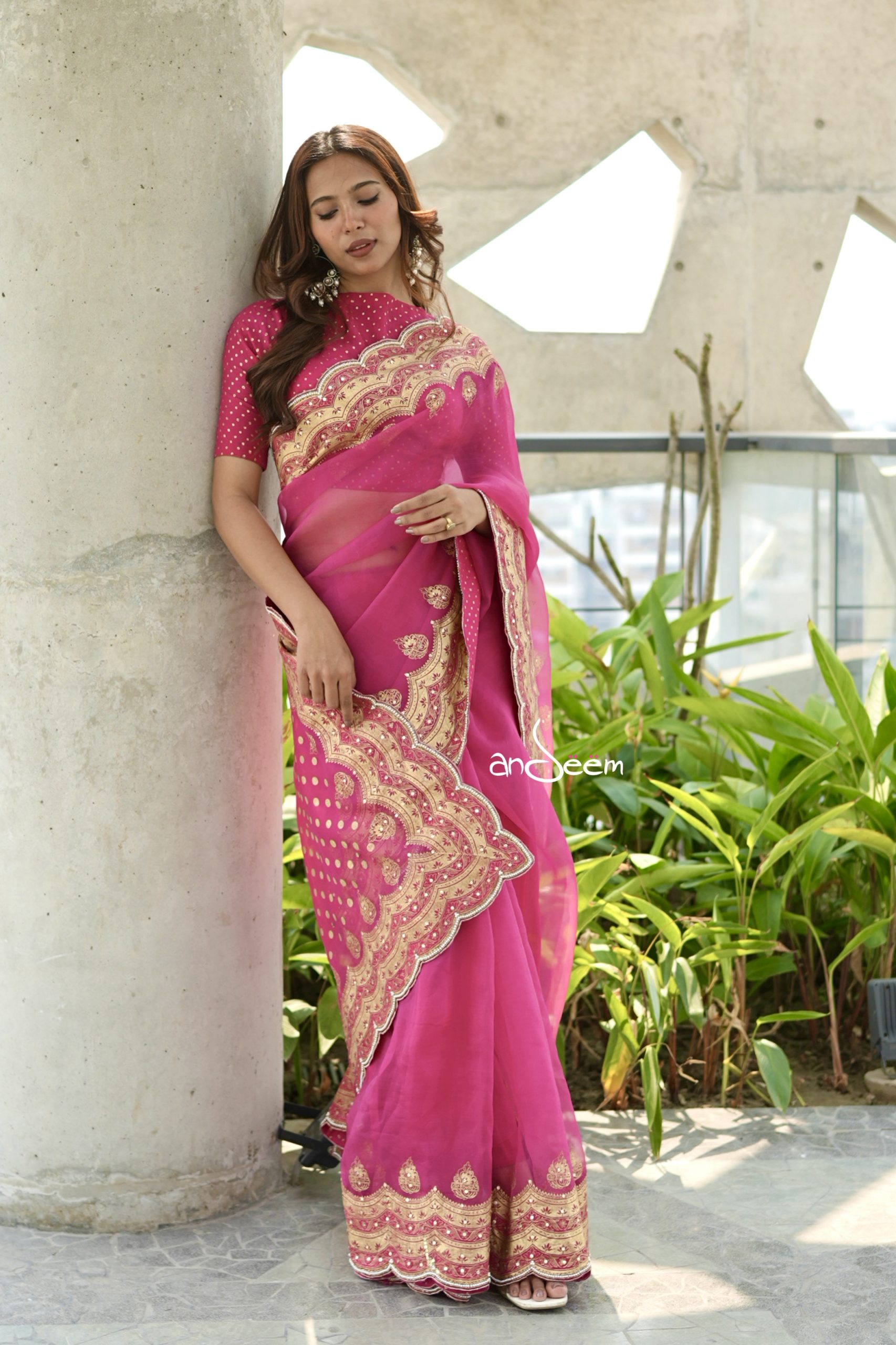 A graceful muslin saree in a fuchsia pink base, beautifully elevated with deep golden scalloped borders and intricate karchupi and screenprint.