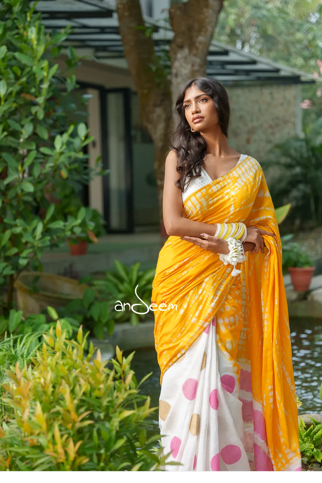 A graceful cotton saree featuring metallic gold and pink polka dots in the kuchi area, complemented by baby pink stripes in the aachol and a mustard yellow tie-dye drape for a touch of elegance.