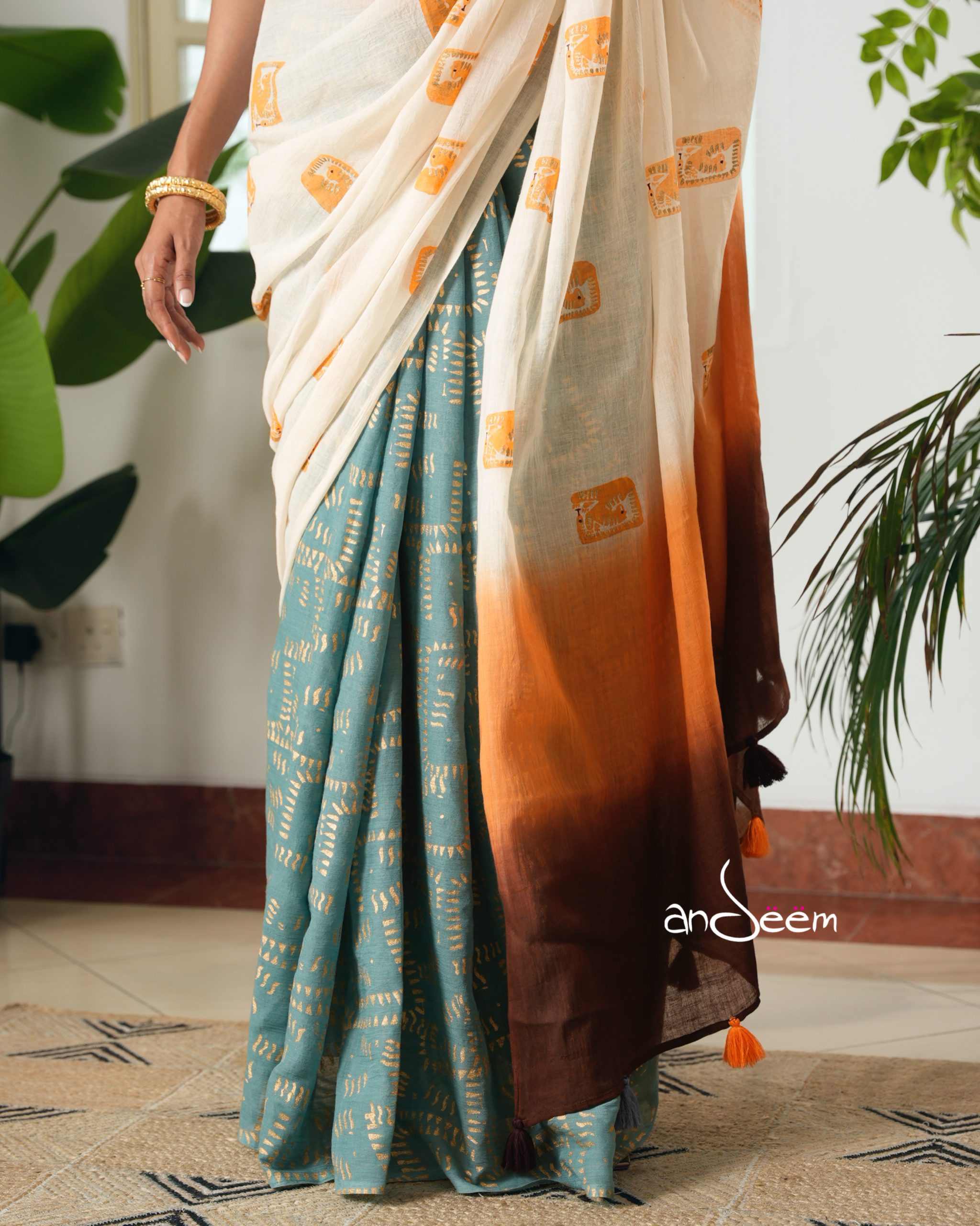 A cotton handloom saree in white and teal blue shades, detailed with golden block work and vibrant orange tiger prints, finished with a bright orange and mocha aachol and matching tassels.