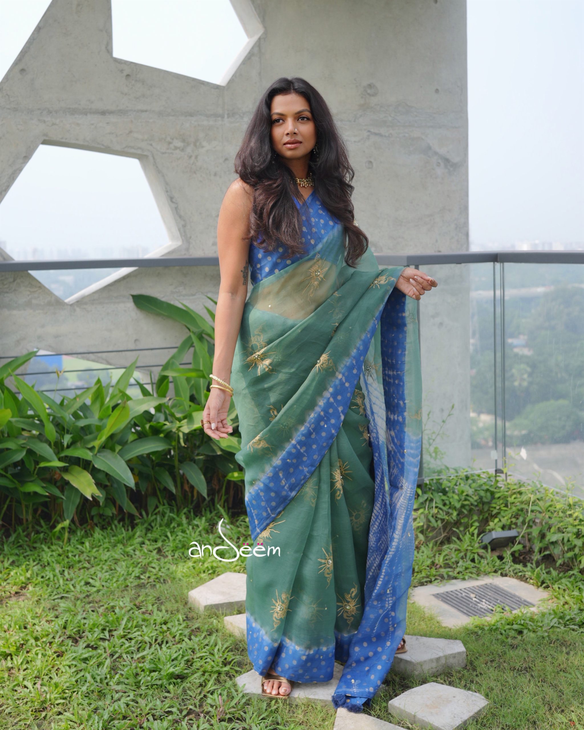 A lightweight jade-blue muslin saree featuring delicate screen prints throughout the body, accentuated with hand-set sequin work. Finished with a tie-dye border and aachol, a polka-dotted screen-printed fall, and tassel detailing. Comes with a solid blue muslin blouse piece.
